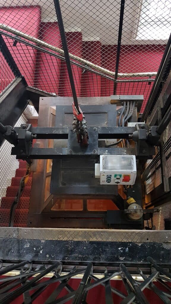 LED shaft lighting was sympathetically installed to offer a bright working environment for operatives without detracting from the shaft lattice work. The lift car top was cleared of all components to restore originality to the lift look and a removable working platform was fabricated. The lift car top controls were skilfully concealed within the lift’s sling with just the mushroom stop switch visible.