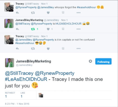 Then each time you reply you use #LeaseholdHour and everyone can easily see what you’ve posted. In fact it was during the first leasehold hour, oh sorry #LeaseholdHour that the question was asked about should the hashtag be all in capitals or lowercase.
