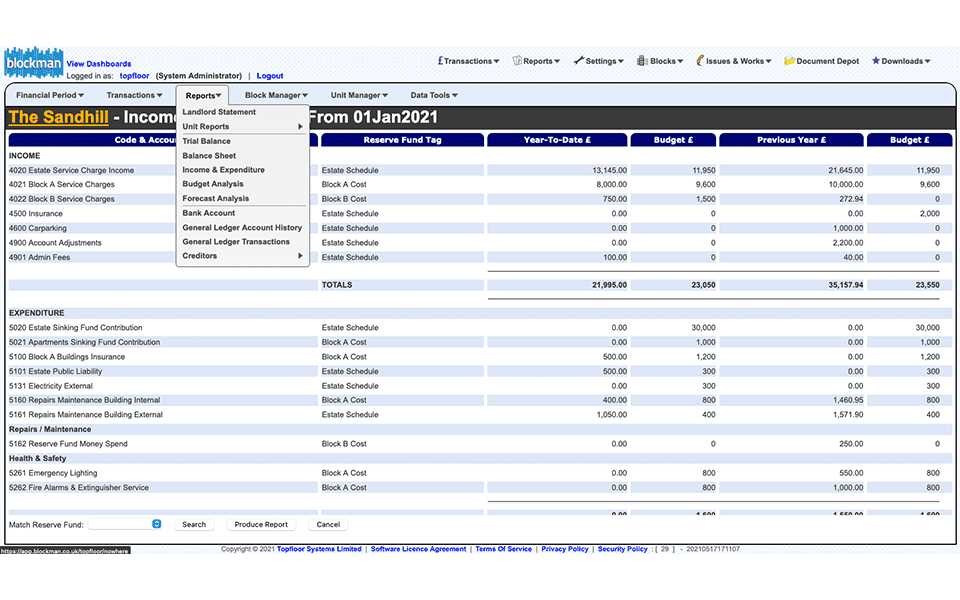 Blockman is a general ledger based financial solution for Property Managers, which means Blockman reports a Balance Sheet, Trial Balance and Profit & Loss account for each block. This a key requirement in enabling multiple lease schedules and service charge / reserve fund transactions and reporting.