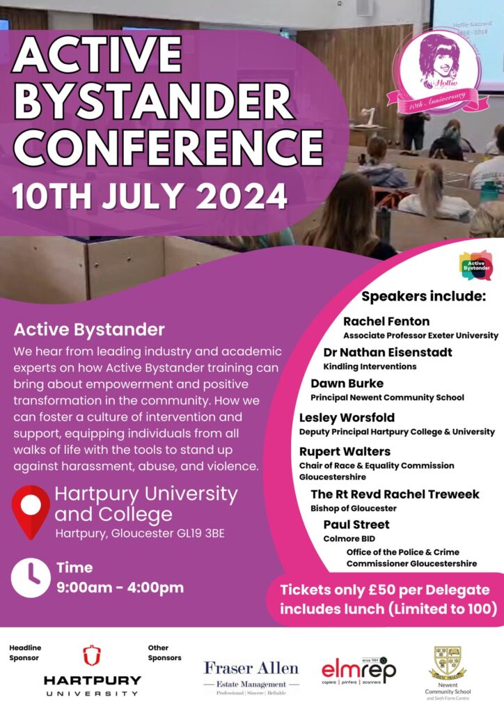 Therefore, in the pursuit of creating a safer and more supportive community, the Hollie Gazzard Trust is gearing up to host the Active Bystander Conference at Hartpury University in Gloucester on 10th July 2024.