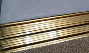 The image here shows the lift car (blue vinyl) and lobby area (carpeted) where the lift and landing sills meet, with the highly polished brass finishes described.