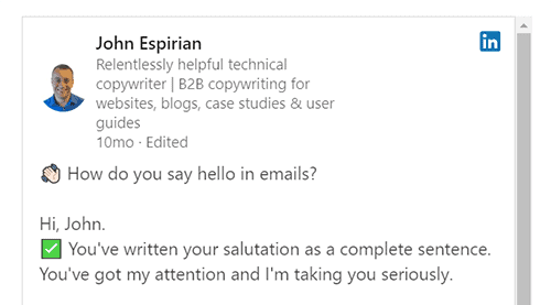 John Espirian is the relentlessly helpful technical copywriter. He regularly creates great posts on LinkedIn to help and support others to increase their knowledge and engagement on the platform.