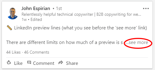 At a minimum, aim to write enough to trigger LinkedIn to display the ‘see more’ prompt.