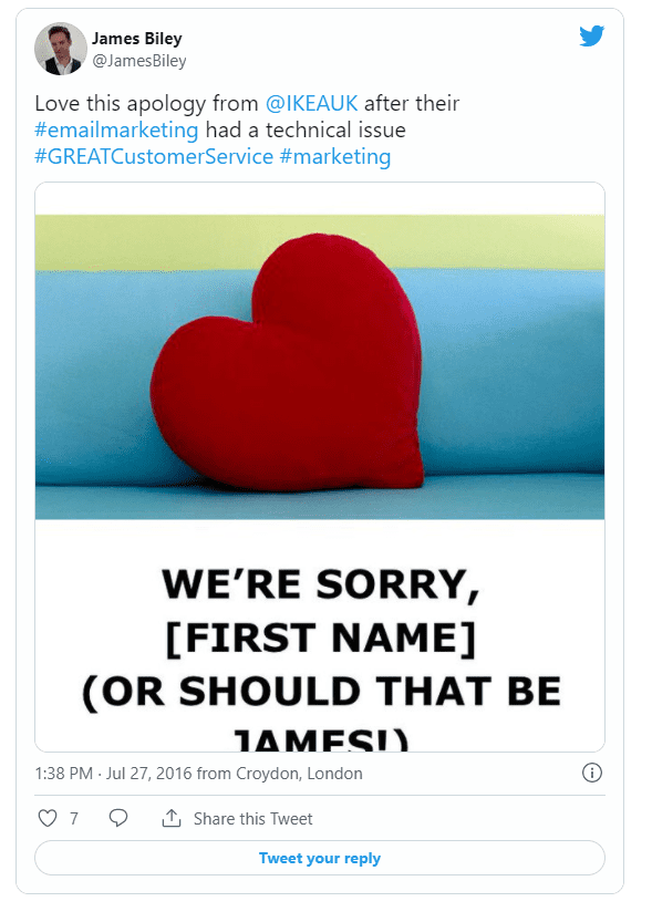 Like the majority of people I’m sure, I receive daily emails informing me about offers and promotions from various stores about a variety of items. You know, those marketing ones that distract you from your work and you suddenly find you’ve bought a deckchair and parasol and an assortment of garden pots for no apparent reason – anyway… This particular email from Ikea caught my (and clearly a few other customers) attention for all the wrong reasons as it started Hello [FIRST NAME] before going on to talk about the promotion. Now most of us probably wouldn’t notice if the date on an email was wrong and we may notice if the name of the town or our address was slightly incorrect, but when it’s our name, well, that’s just not acceptable is it?! What it looked like was that no one had bothered to enter the customers name into the email marketing template. One can only assume that the template was meant to auto-populate from a merge field and for some reason it hadn’t, and worse still the emails had all been sent.