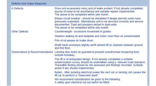 It is a legal obligation for passenger carrying lifts to be regularly maintained and inspected by a “competent” person every 6 months. The information detailed from the LOLER (Lifting Operations, Lifting Equipment Regulations) reports are generally a good guide as to the condition of a lift installation, the below was taken from a lift we are in the process of upgrading (and not a moment too soon according to the information provided).