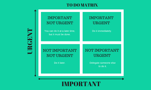 Imagine a box which is divided into quarters. The bottom half is labelled unimportant while the top half is important. The right half is non-urgent and the left half is urgent. Every time you receive a task, assign it to one of the quarters.