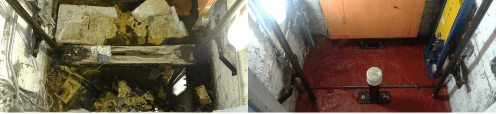The lift pits were full of debris and had water ingress issues, during the refurbishment works the water issue was addressed and the debris removed. As part of the works the pit has been sealed in an oil retardant red paint. Polyurethane car and counterweight buffers have been installed to aid with energy absorption in the event of collision (protecting passengers and equipment alike) and with the addition of new shaft lighting has created a much improved and safer working environment for maintenance personnel.