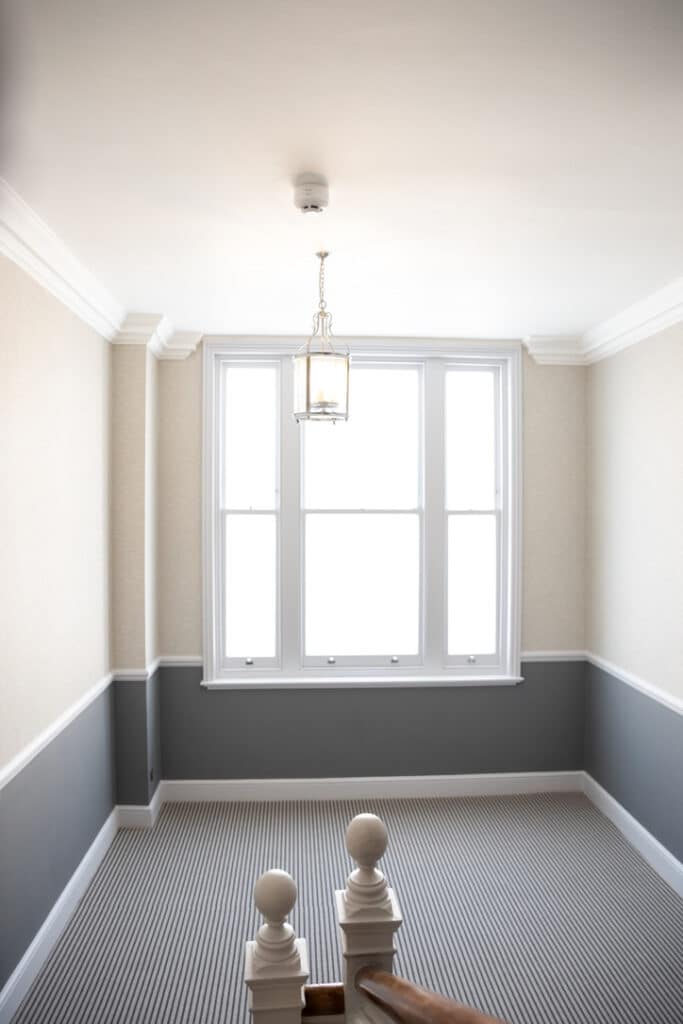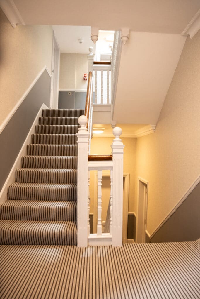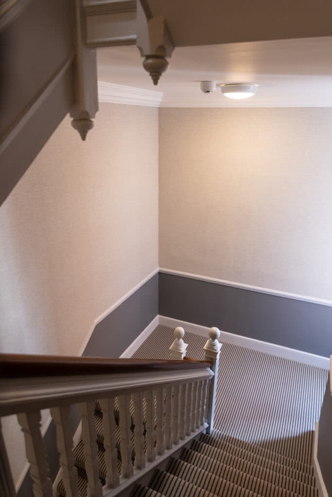 Installing new carpets to match the chosen colour schemes further enhanced the communal areas’ visual appeal. Additionally, safety was a top priority; the installation of a new fire alarm system and thorough testing of all electrical systems ensured compliance with modern regulations. The restoration of the marble flooring in the entrance lobby added a final touch of elegance, reaffirming the building’s prestigious status.