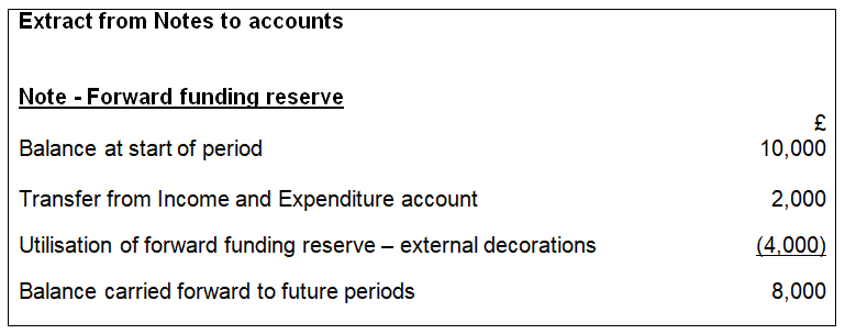In this example the reserve fund was £10,000 at the beginning of the year. £2,000 was included in the current year budget as an amount to be collected and transferred to the reserve fund. £4,000 was spent out of the reserve fund to carry out external decorations leaving a remaining balance of £8,000.